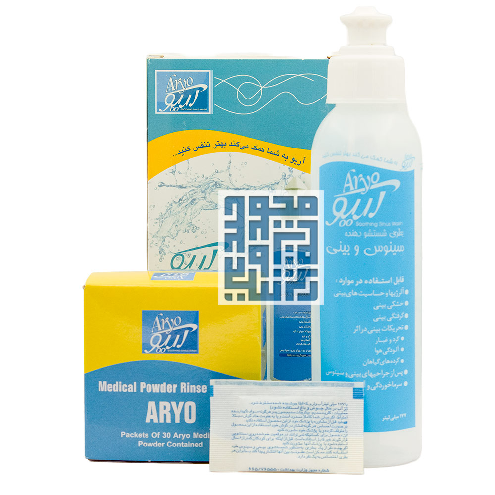 با 170 میلی لیتر آب ولرم یا سرد بطری را پر کنید . به منظور تهیه محلول هایپرتونیک سه بسته و برای تهیه محلول ایزوتونیک یک بسته پودر مخصوص آریو را در بطری بریزید. نی را کاملا در قسمت زیرین در بطری قرار دهید. به منظور حل کردن پودر آریو در آب ، بطری را خوب تکان دهید. نازل در قوطی را با بالا آوردن باز کنید دهان خود را باز کرده و نازل را روی یکی از سوراخ های بینی خود قرار دهید ، بطری آریو را به آرامی فشار داده تا محتویات آن از دهان یا سوراخ دیگر بینی شما خارج شوند. این عمل را چندین بار تکرار کنید و سپس همان کار را در سوراخ دیگر بینی خود تکرار کنید. پس از آن به آرامی در بینی خود بدمید.