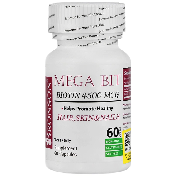 کپسول بیوتین مگابیت 4500 میکروگرم برونسون منبعی غنی از ویتامین B7 است که با حمایت از متابولیسم سلولی، به بهبود سلامت مو، پوست و ناخن کمک می‌کند. این مکمل در کاهش ریزش مو، افزایش استحکام ناخن‌ها و حفظ بافت سالم پوست نقش مؤثر دارد.