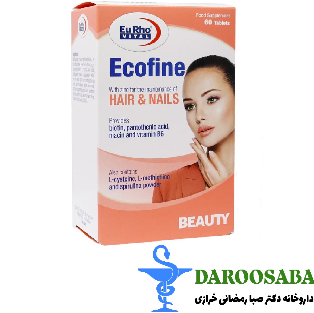 قرص اکوفاین یوروویتال تامین کننده ترکیبی کامل و متعادل از مواد لازم جهت حفظ سلامت و زیبایی مو و پوست است. روی به کار رفته در این مکمل دارای تاثیرات مفید گوناگون در بدن است. این ترکیب نقش مهمی در حفظ سلامت مو و ناخنها دارد. به طور مثال جهت حفظ سلولها در برابر استرس اکسیداتیو و سنتز پروتئین مورد نیاز است و دیگر آن که در روند تقسیم سلولی حائز اهمیت است. نیاسین و بیوتین به کار رفته در قرص تقویت مو معرفی شده نیز در حفظ سلامت پوست و موهایی سالم و شاداب نقش دارند. ویتامین b6 قرص Ecofine یوروویتال در سنتز طبیعی سیستئین موثر است. سیستئین نیز یک نوع اسید آمینه نیمه ضروری در بدن است که یکی از اجزای طبیعی تشکیل دهنده ساختار مو و کراتین ناخن محسوب میشود.
