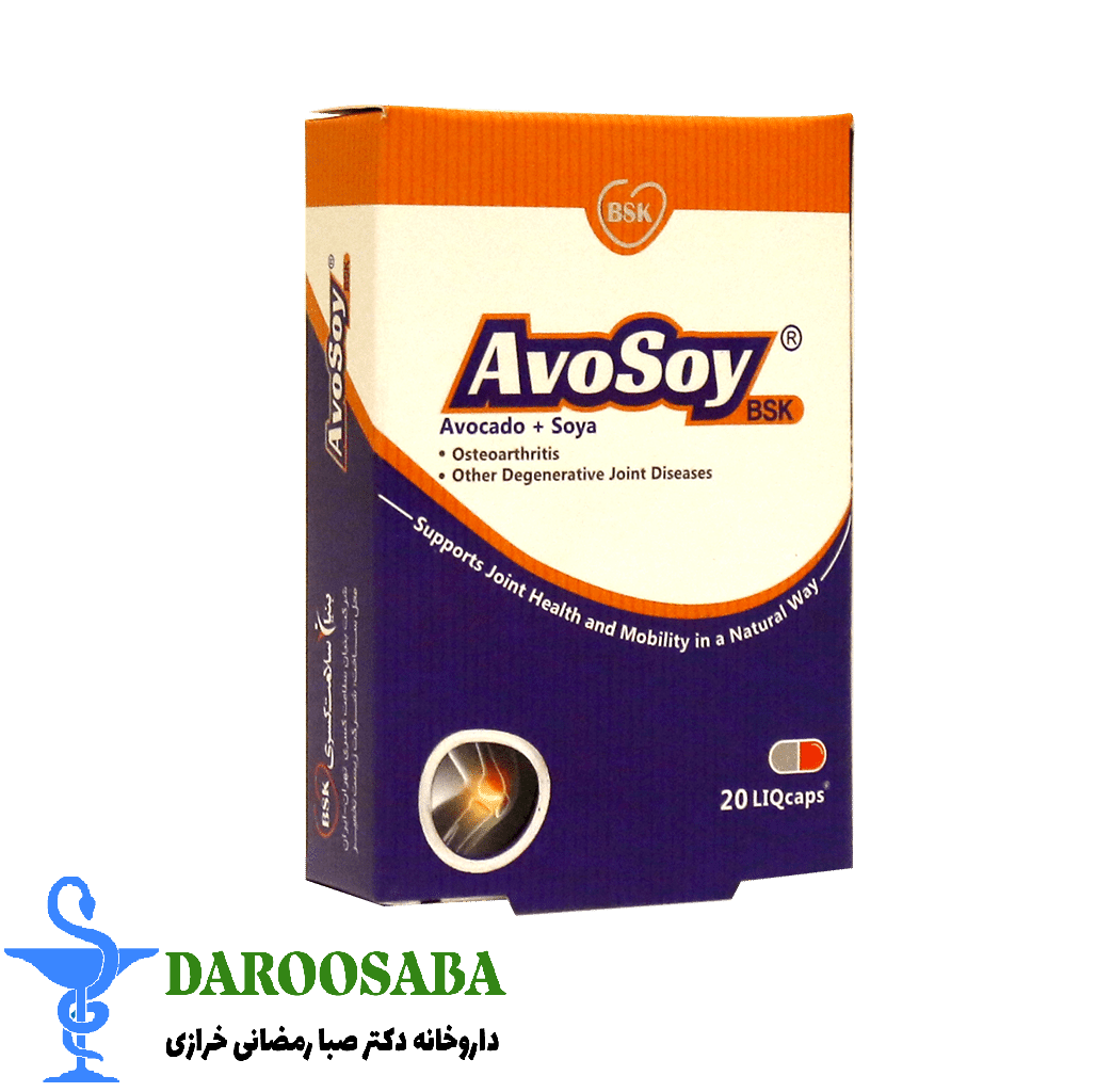 کپسول آوسوی بی اس کی مکمل گیاهی حاوی سویا و آووکادو است. کپسول avosoy با اثر بر بافت همبند به وسیله تحریک تولید پروتئو گلیکانها و کلاژن باعث برگرداندن ساختمان غضروف به حالت طبیعی میشود. علاوه بر این، با مهار تولید واسطههای التهابی مانند پروستا گلاندین E2 و کاهش التهاب در مفاصل باعث کاهش درد و بهبود از کار افتادگی میشود.