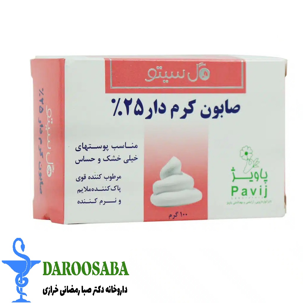 صابون کرم دار 25 درصد گل سیتو حاوی 25 درصد کرم مرطوب کننده است که رطوبت پوست را حفظ کرده و سبب ایجاد شادابی و درخشش بر روی پوست می شود.